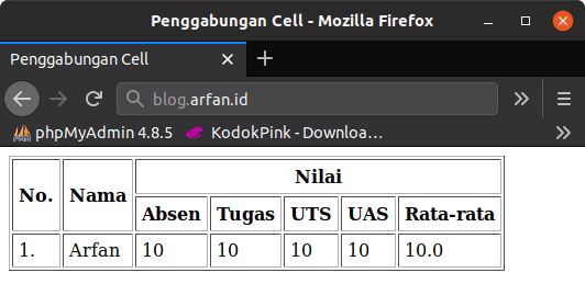rowspan="2". Artinya saya menggabungkan 2 baris kebawah. Hasilnya baris ke-1 dan ke-2 digabung. - Pada kolom “Nilai” saya menggunakan